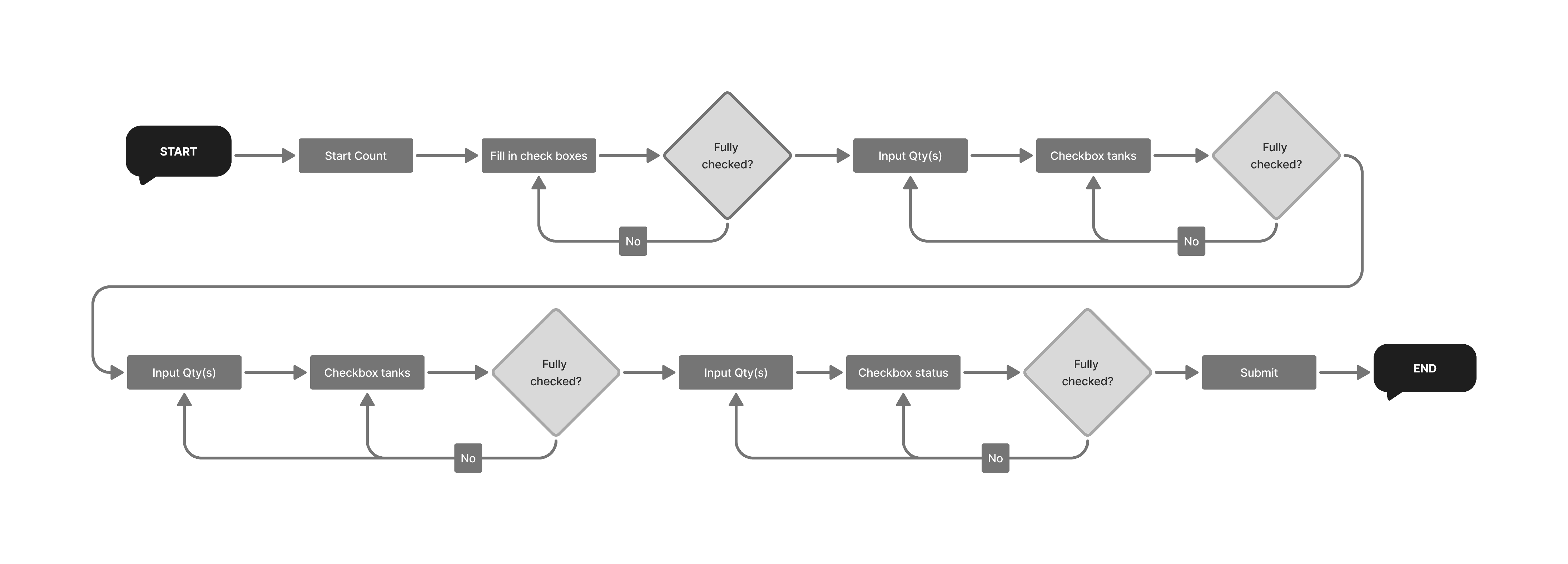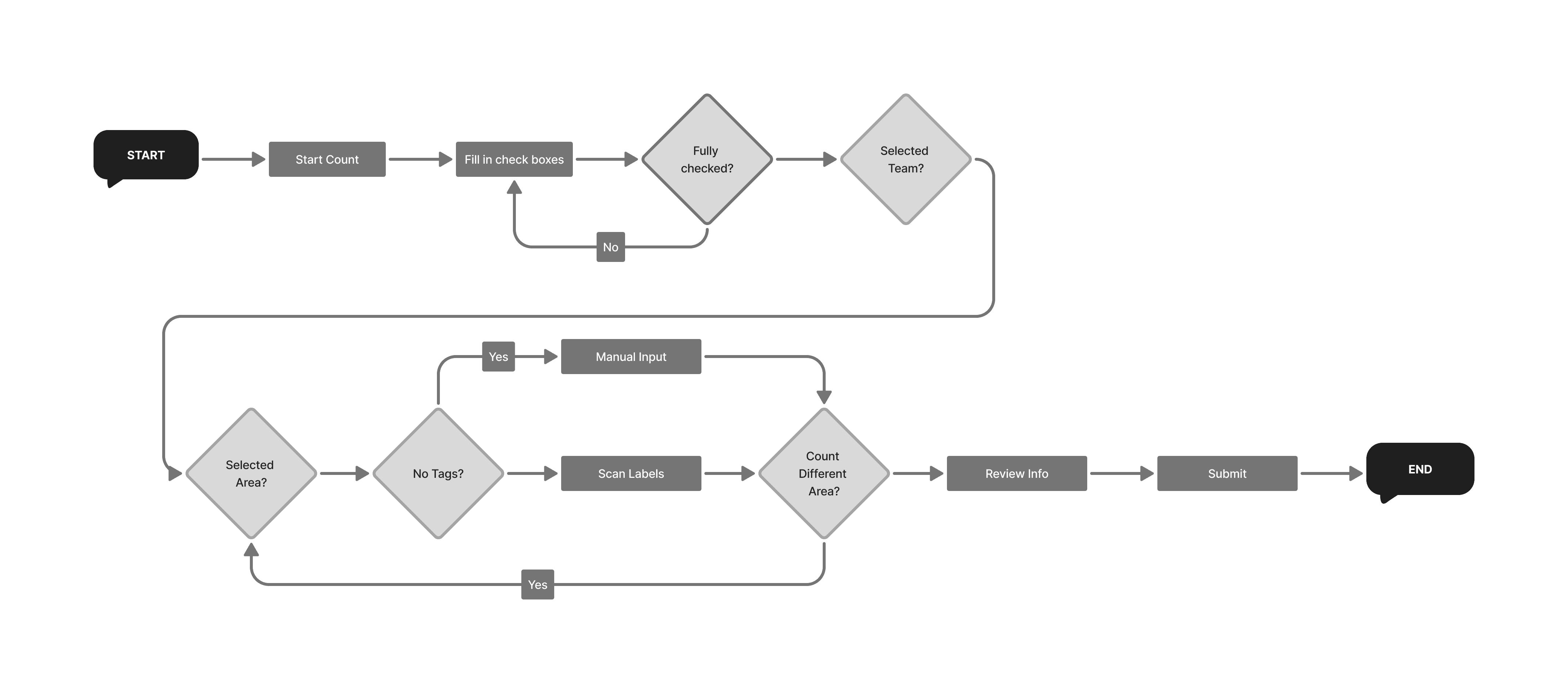 User flows were mapped for the main counting process to understand how users complete cycle counts and identify opportunities for simplification. This helped uncover unnecessary steps and improve overall workflow efficiency.